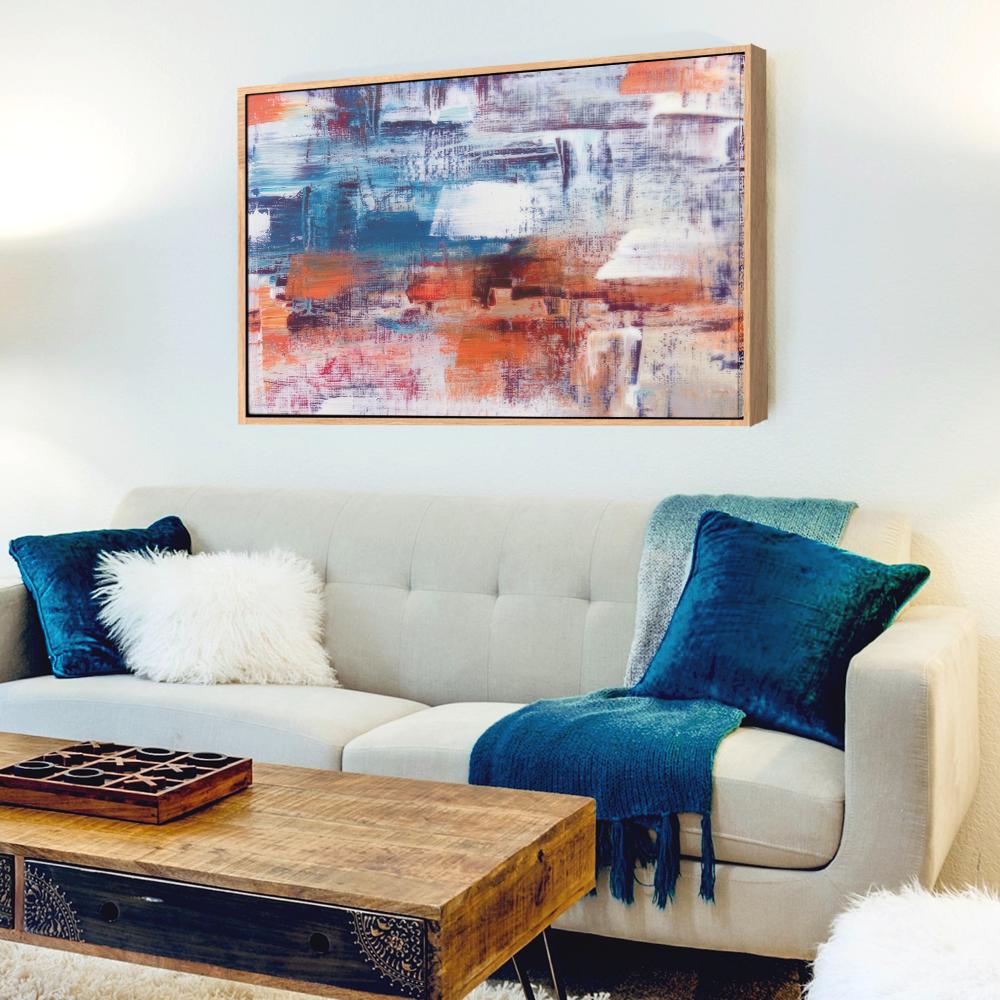 Cuadro Decorativo Wall Decó Abstracto Naranja, Blanco Y Azul 140X90 Cm Lienzo Con Marco Negro Abo 016