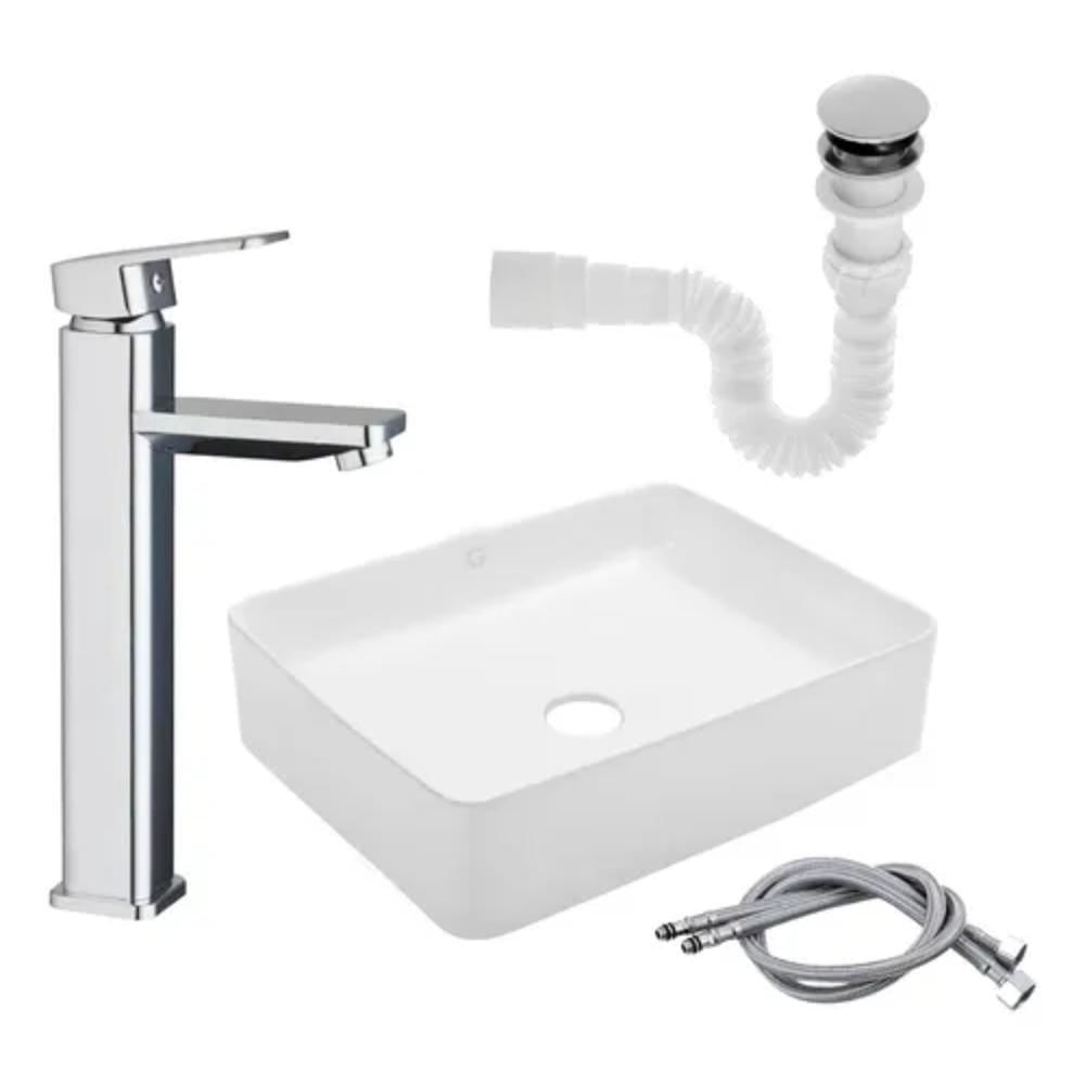Kit Lavamanos Rectangular Blanco + Grifo Monocontrol Cuadrada Cromo + Push Flexible Accesorios Baño