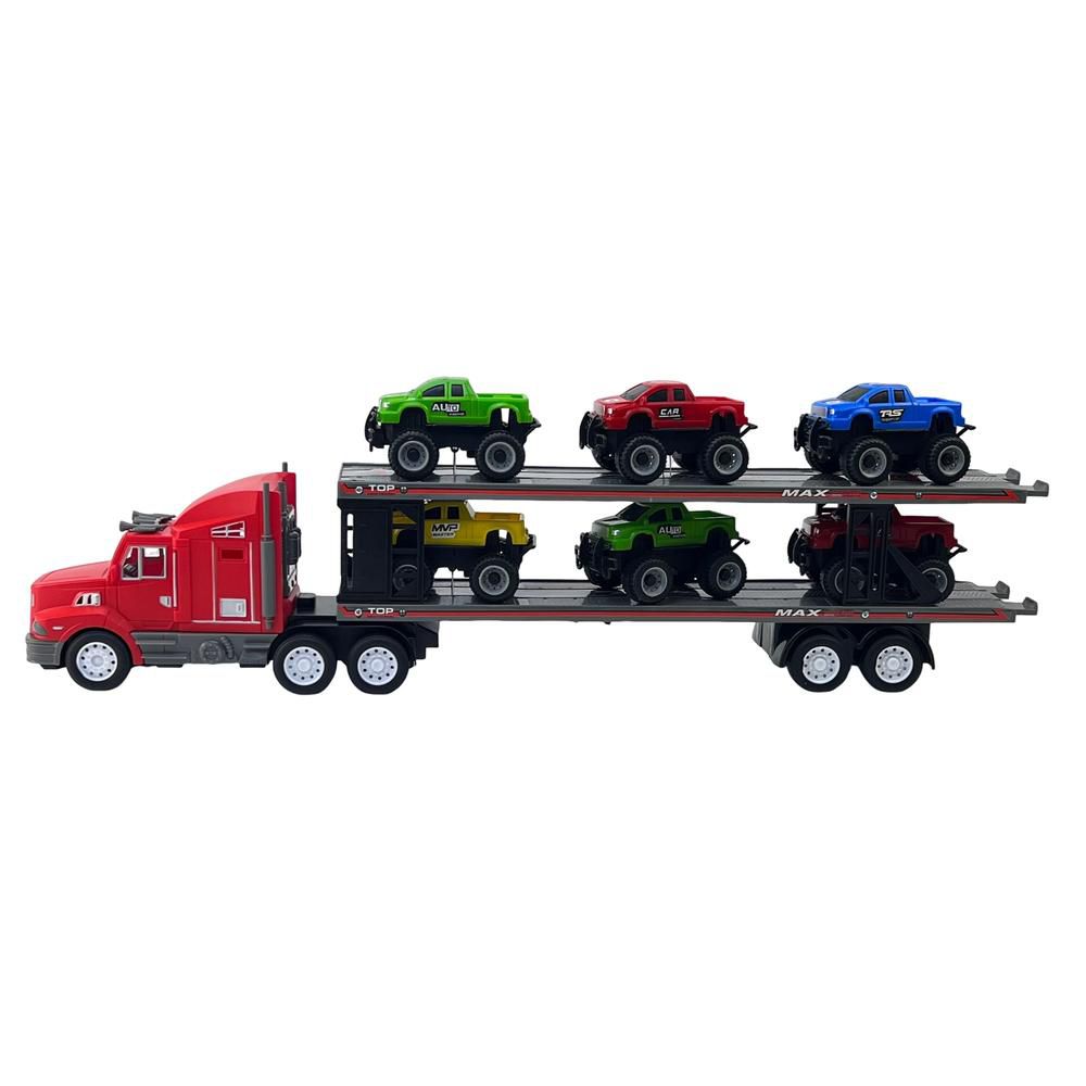 - Carro a RC tipo trailer con parte trasera extraíble - 6 vehículos pull back extraíbles- Movimiento multidireccional- Ruedas rígidas recubiertas de goma para mayor ligereza en otros entornosESPECIFICACIONES TÉCNICAS- Batería LiPo 3.7V (Incluida)- Autonomía: 20 a 25 minutos Aprox- Frecuencia control remoto: 27 MHz.- Alcance RC: 10 a 15 m Aprox- Tiempo de carga: 2-3 horas Aprox.- Control remoto requiere 2 baterías AA (No incluidas)